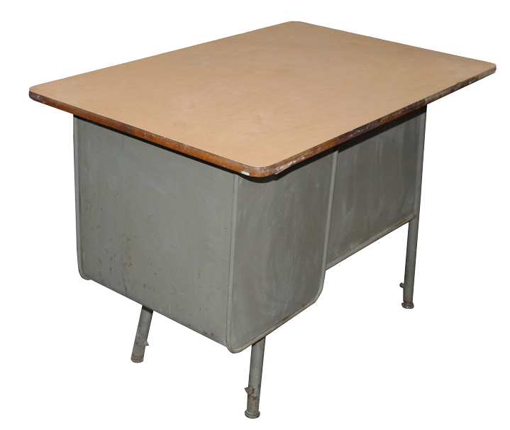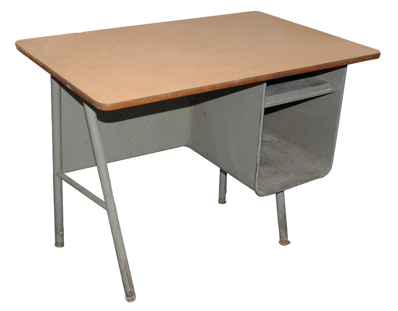 Grey, metal school desk with right side, two-shelf cubby and wooden, rectangular top.