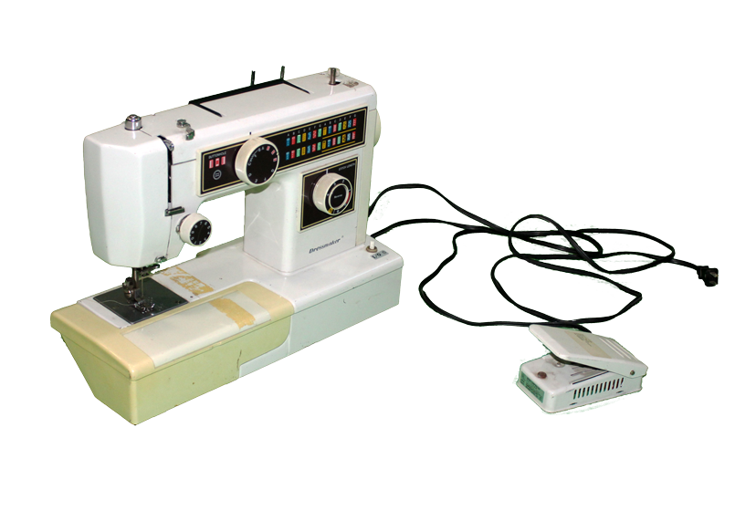 White Dressmaker 6102FA portable sewing machine with black handle, power cord, and foot pedal.