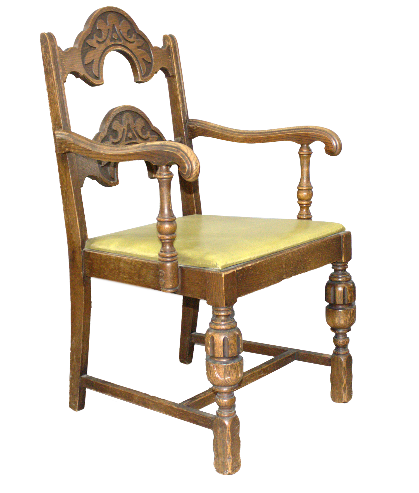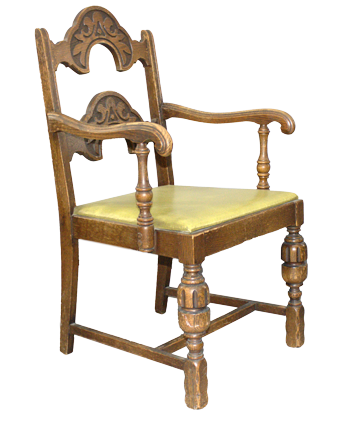 Brown, wooden armchair with pressed back rails, turned legs and arm supports, and pea green, vinyl seat cushion.