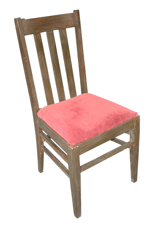 Dark brown, wooden, slat back, side chair with burgundy, fabric seat cushion.