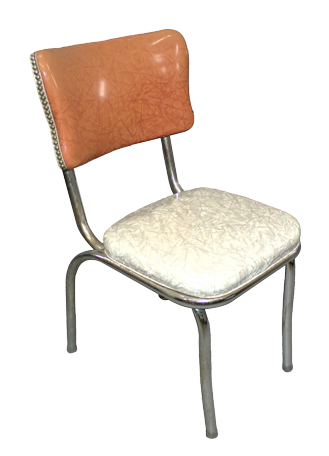 Orange/grey, marble patterned, vinyl side chair with metal frame.