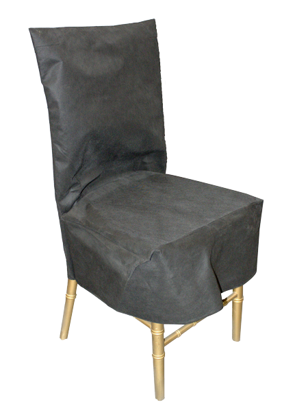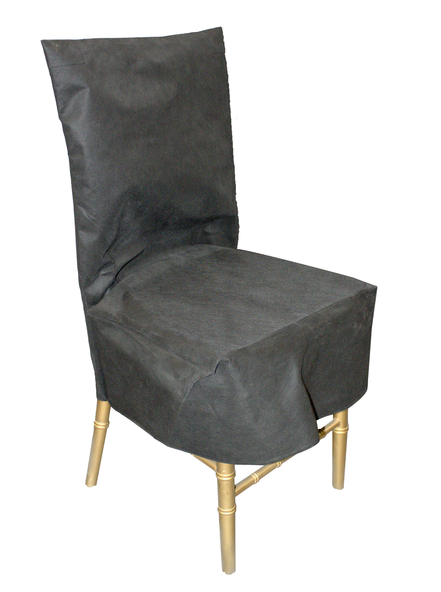 Gold, wooden, ladder back side chair with removable, grey seat cushion, turned spindles, and removable, black, fabric slip covers.