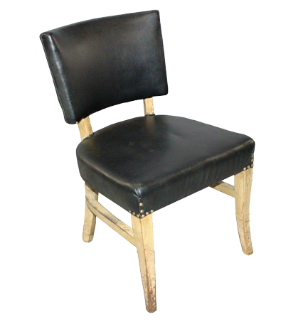 Black, vinyl side chair with tufted, nailhead back and wooden legs.