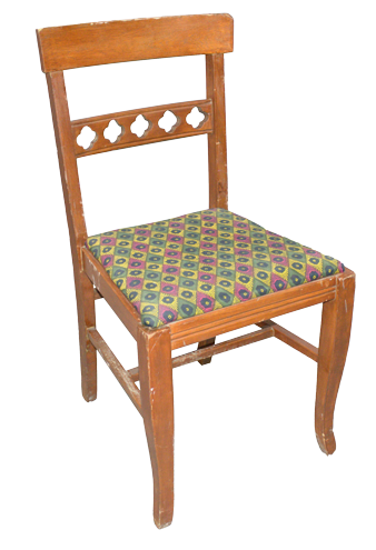 Red/brown, wooden side chair with quatrefoil cutouts in the mid rail and pink/green/yellow/black, diamond/circle pattern, cotton seat cushion.