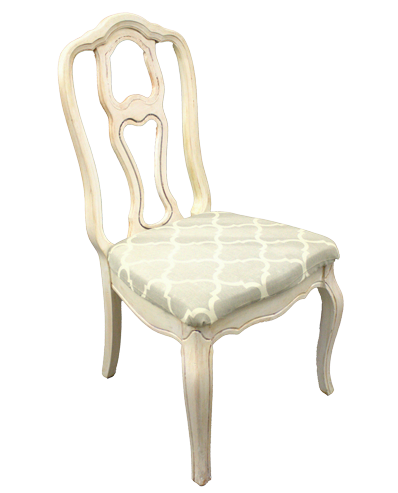 Antique white, wooden, side chair with open fiddleback design and white/grey, quatrefoil pattern, cotton seat cushion.