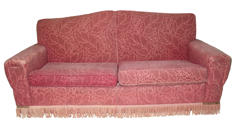 Dark pink sofa with raised leaf and swirl pattern and light pink fringe skirt.