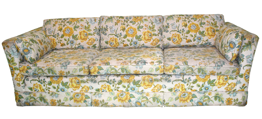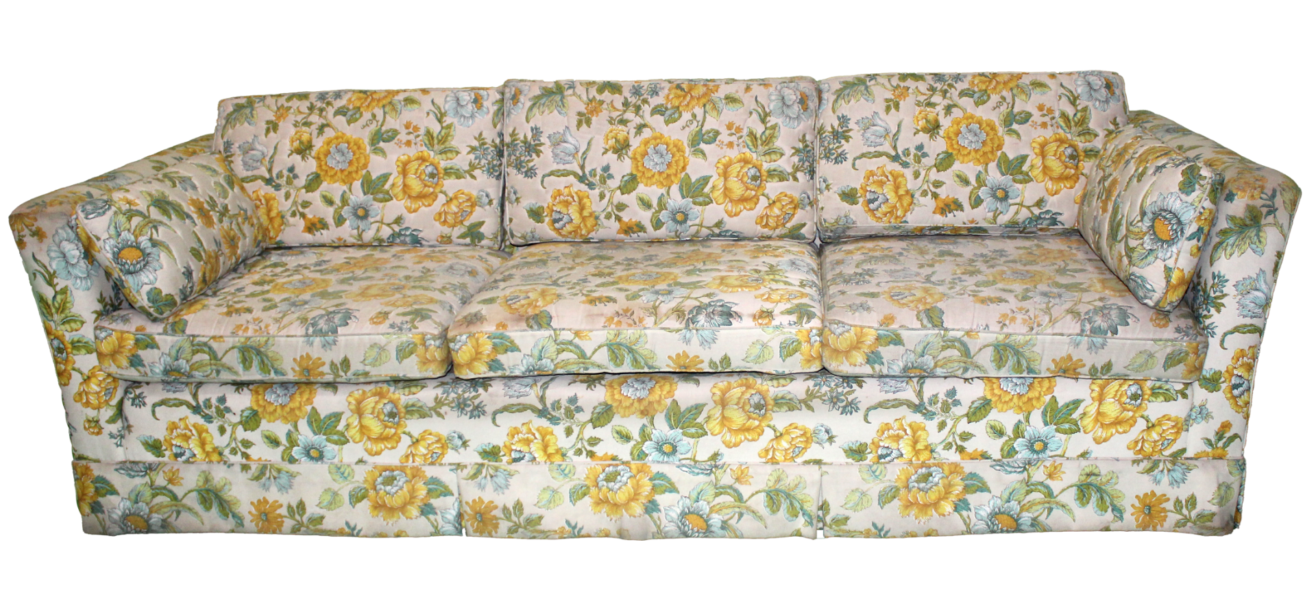Off white, blue/yellow floral print fabric sofa with skirting, two throw pillows and arm covers.