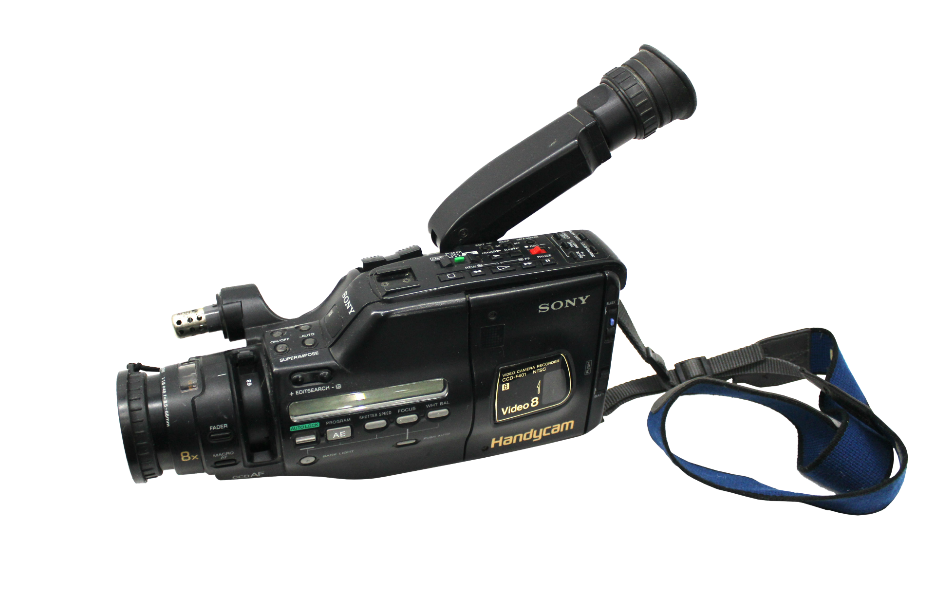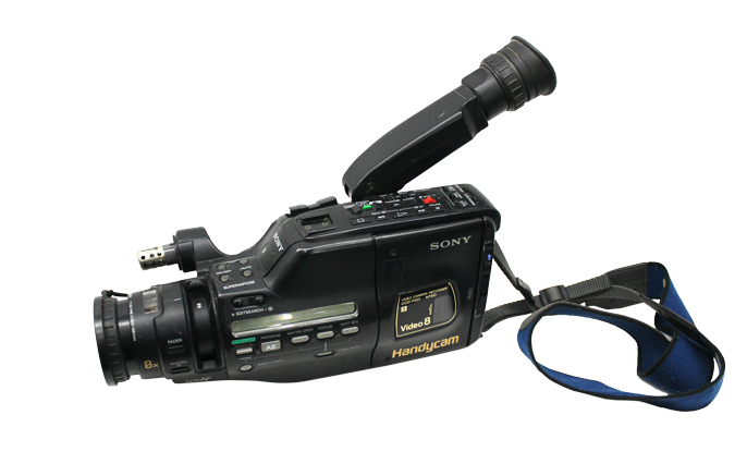 Black Sony CCD-V101 Handycam Hi8 camcorder with grip belt.