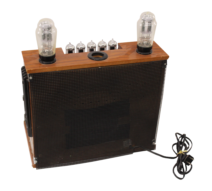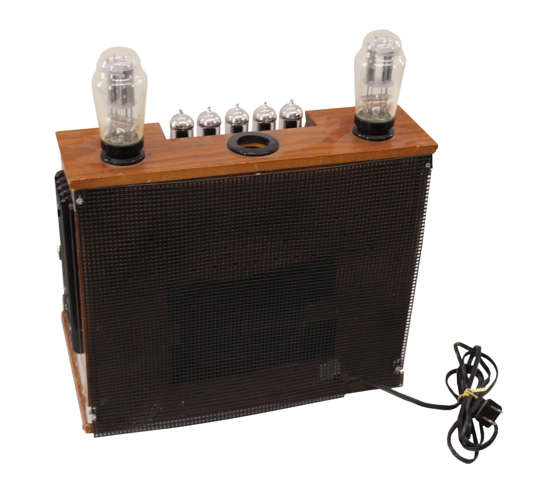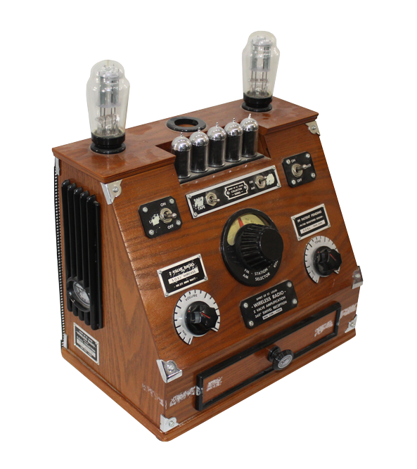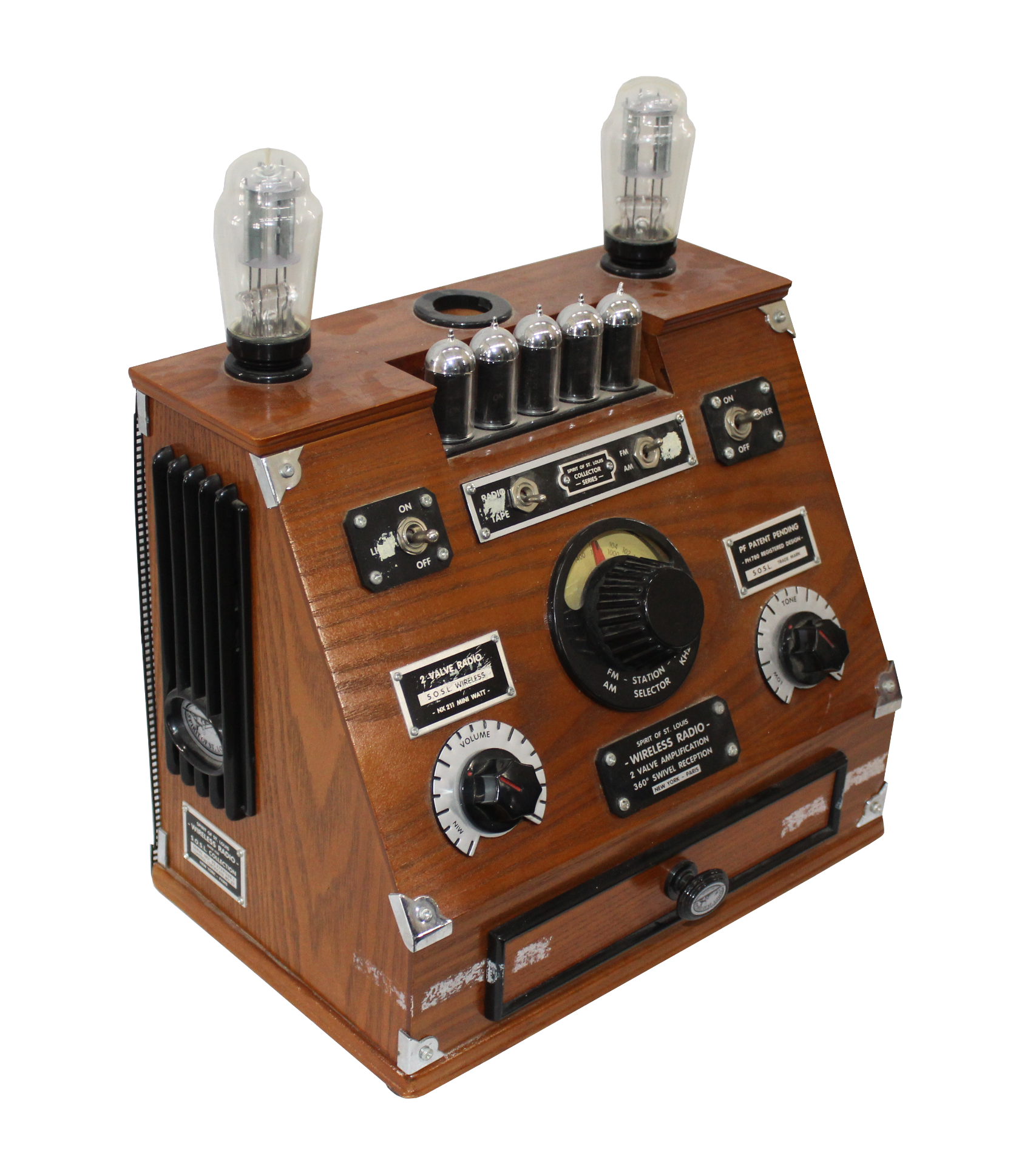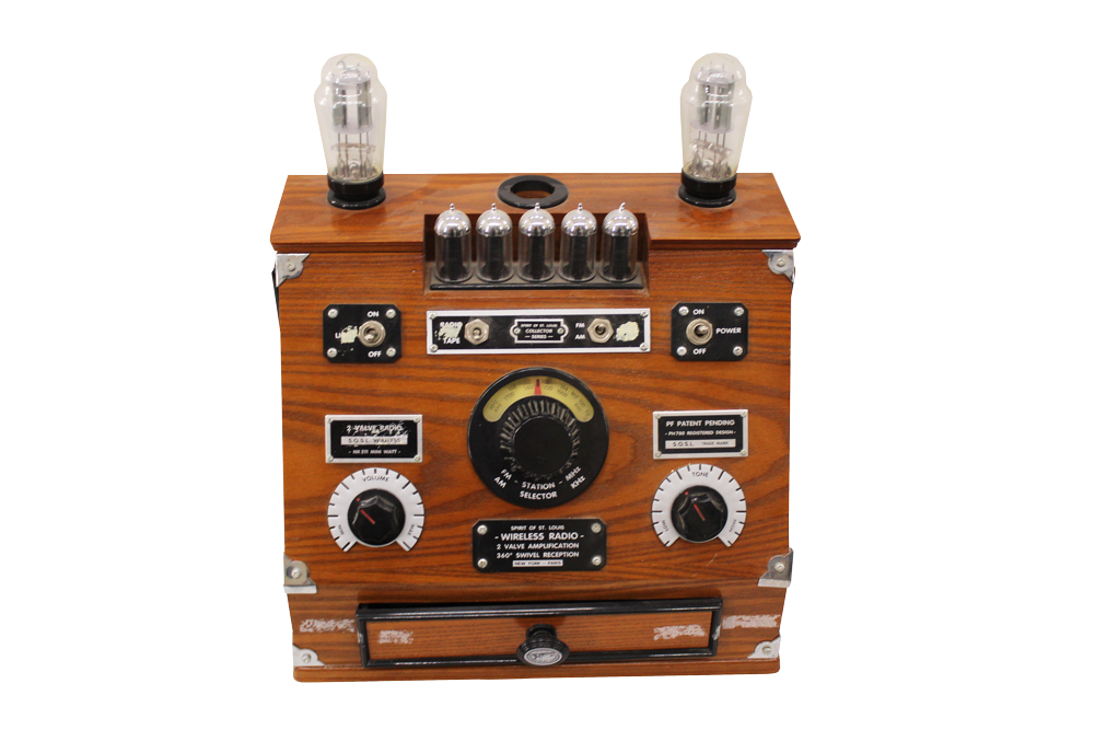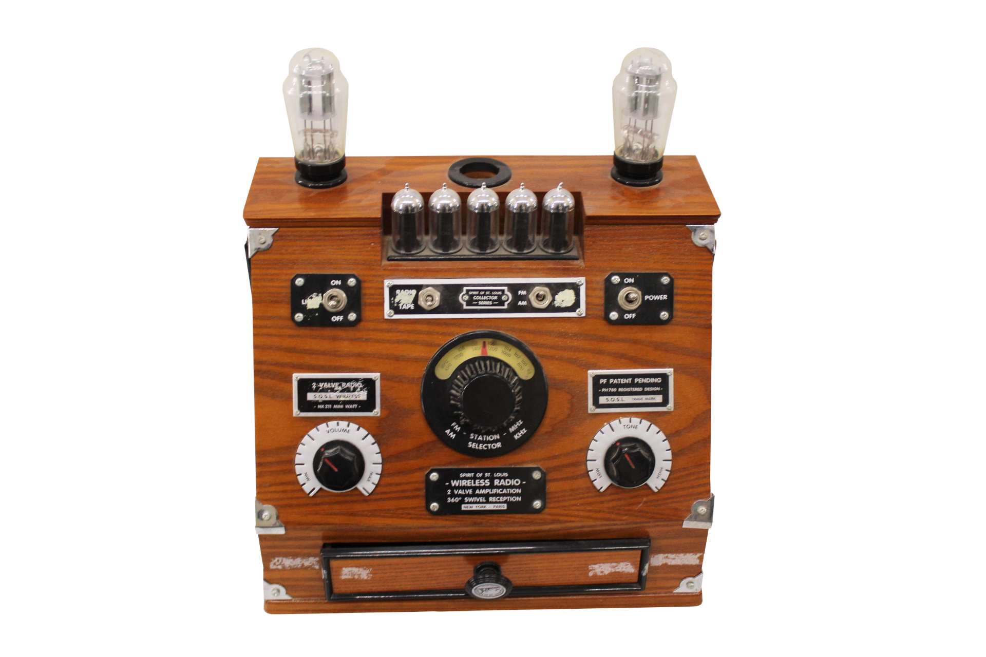 Cherry toned wood Spirit of Saint Louis wireless valve AM/FM radio and cassette player with attached power cord.