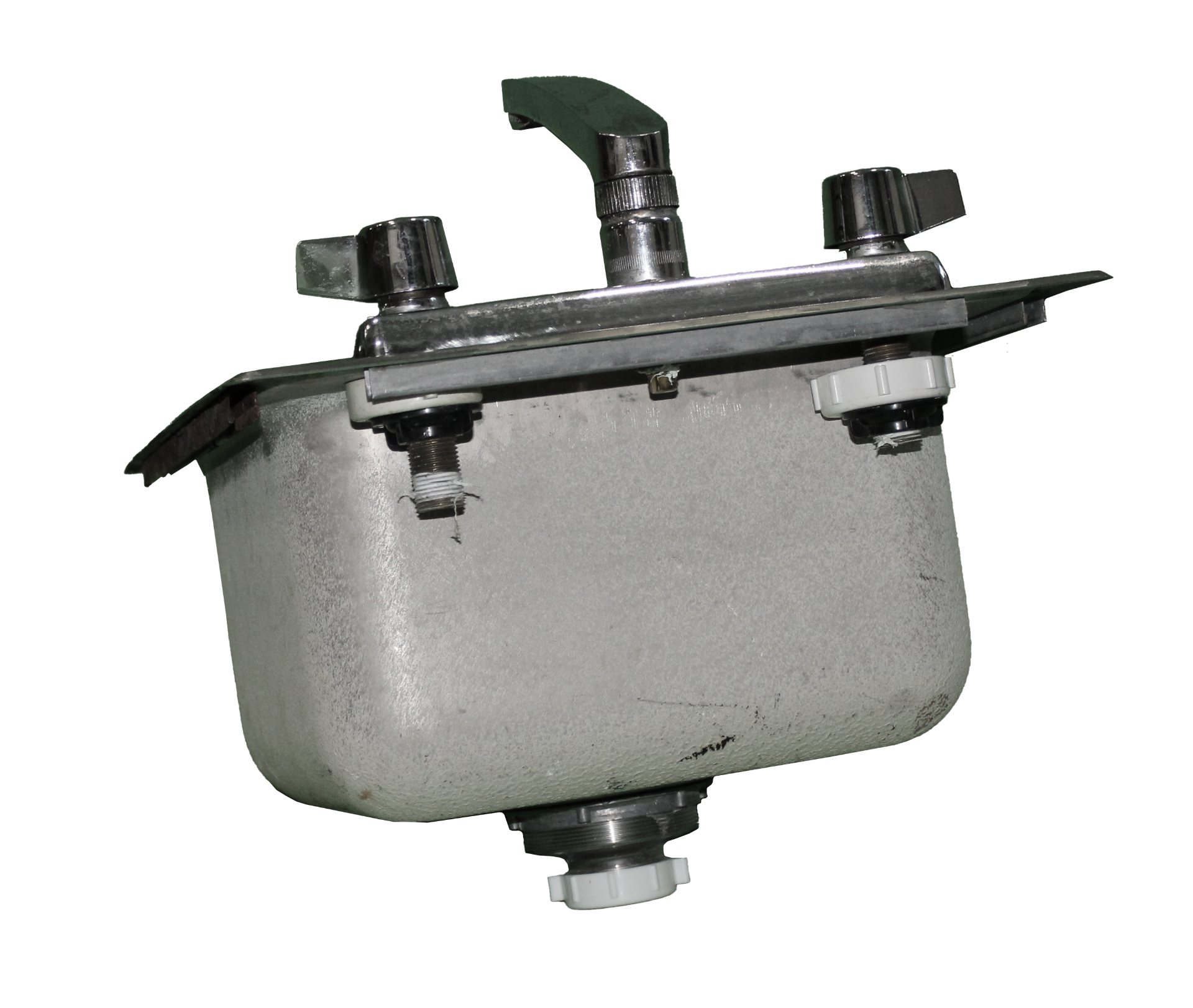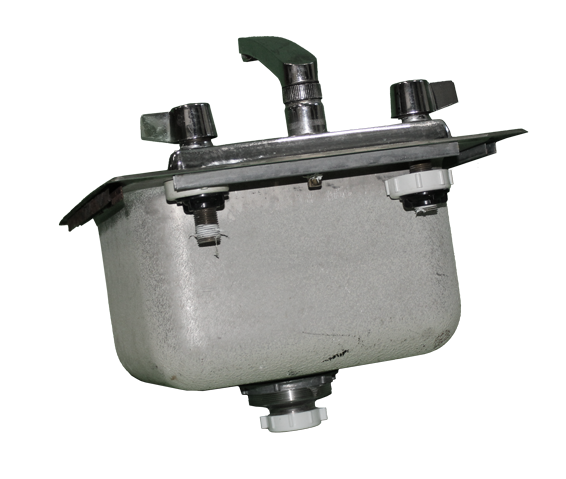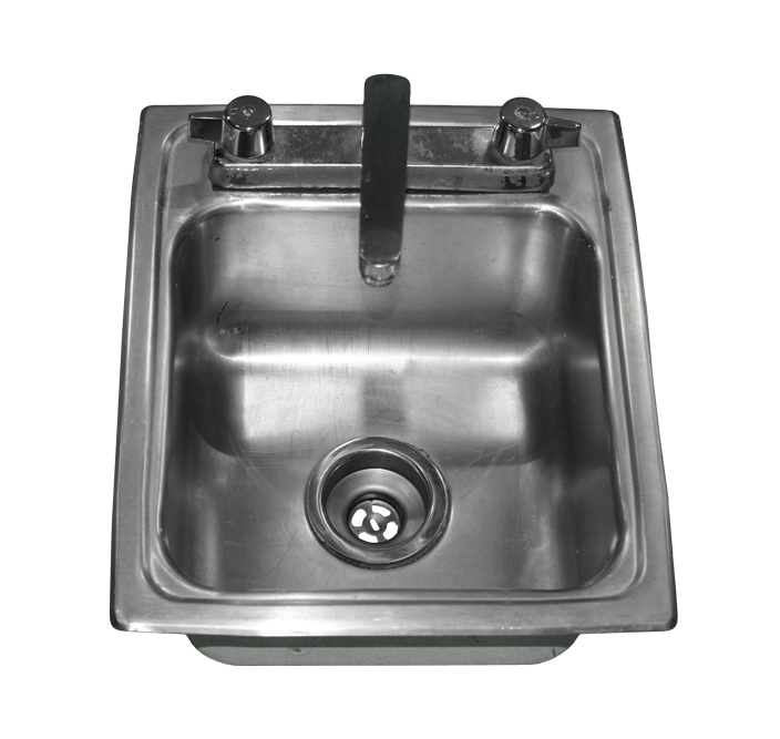 Stainless steel, square, single basin, kitchen sink with double handle faucet.