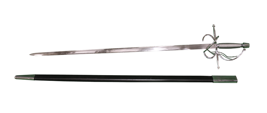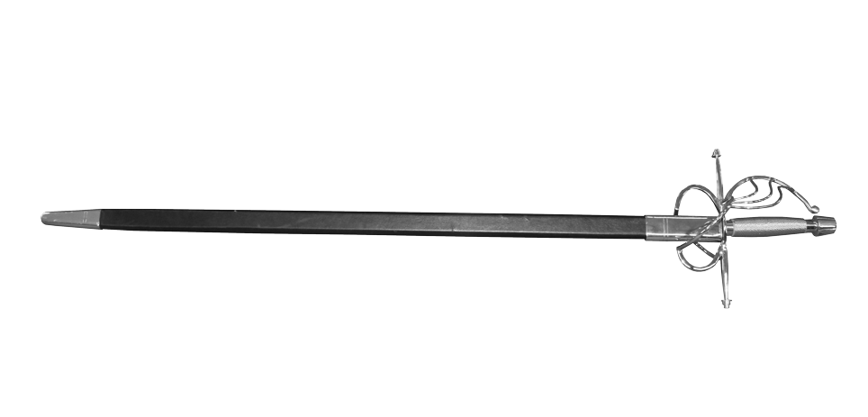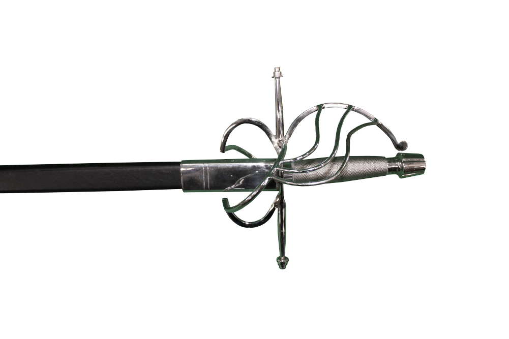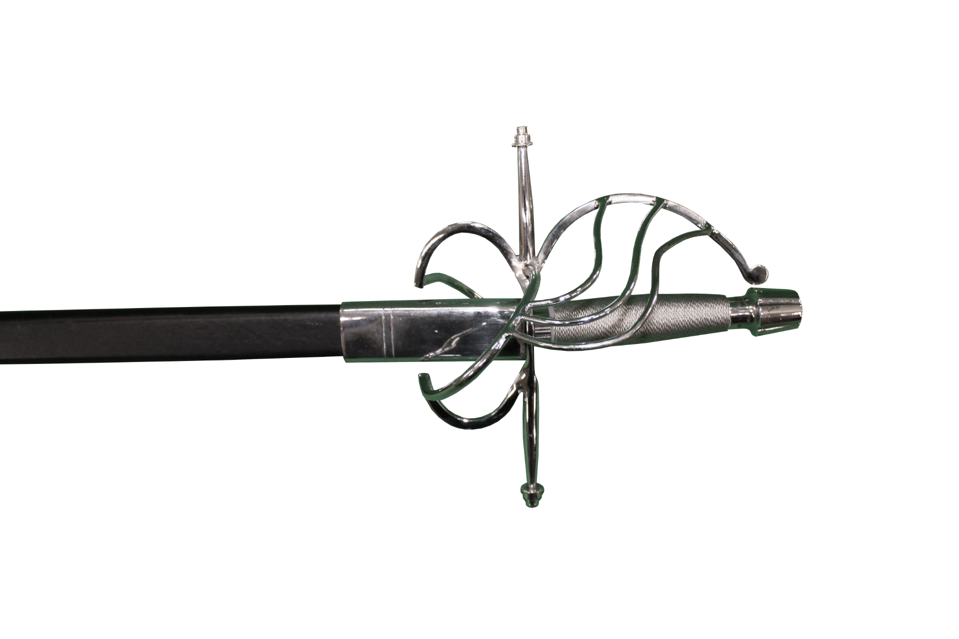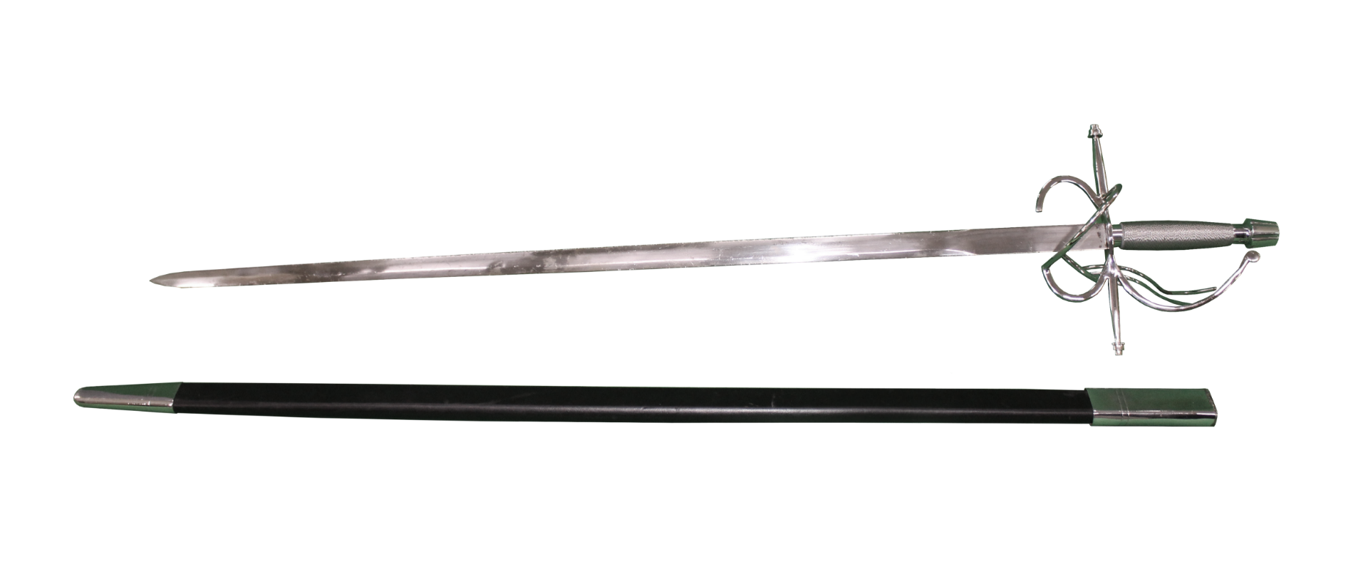 Stainless steel Stormblade rapier with basket hilt and wood/metal scabbard wrapped in black leather.