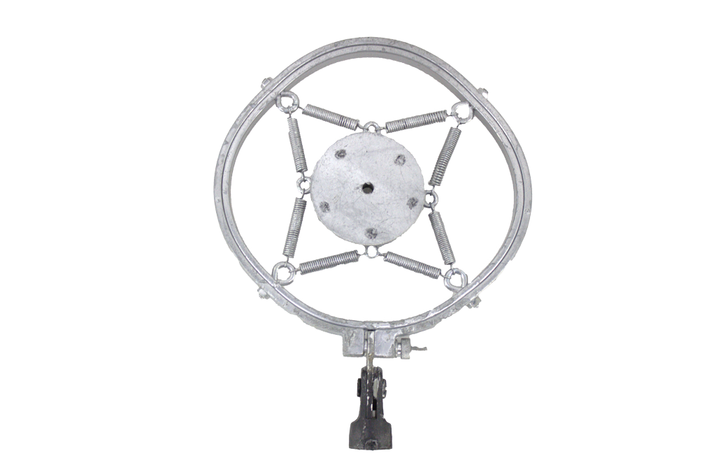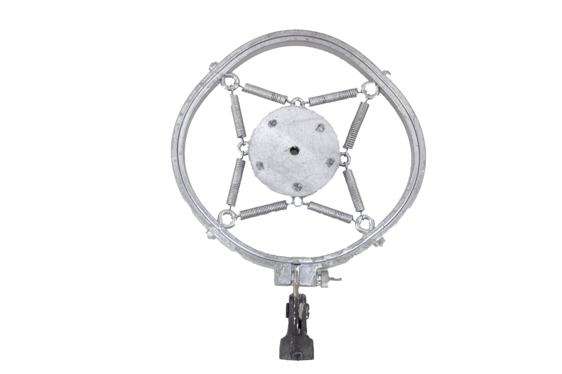 Silver, wooden, circular microphone with spring suspension and threaded stand mount.