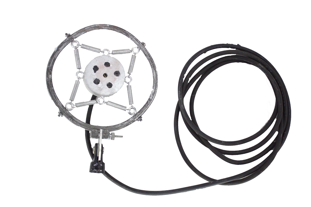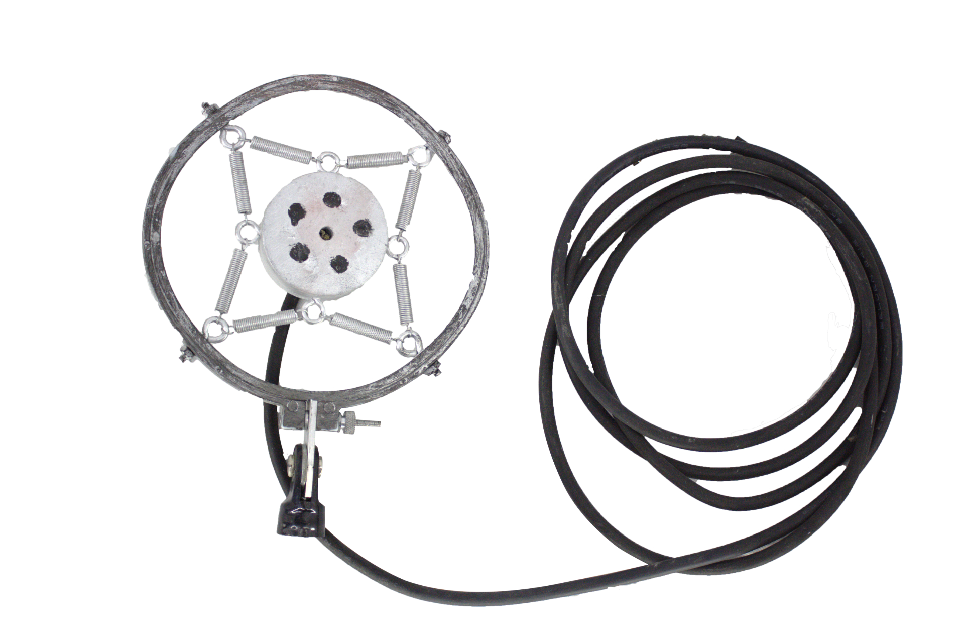 Silver, wooden, circular microphone with spring suspension, threaded stand mount and attached black and chrome angled 1/4" TRS cable.