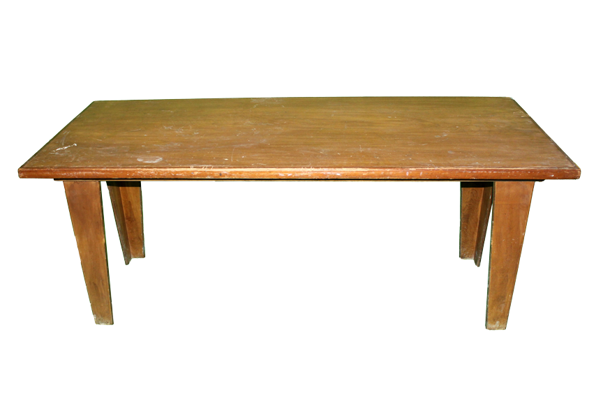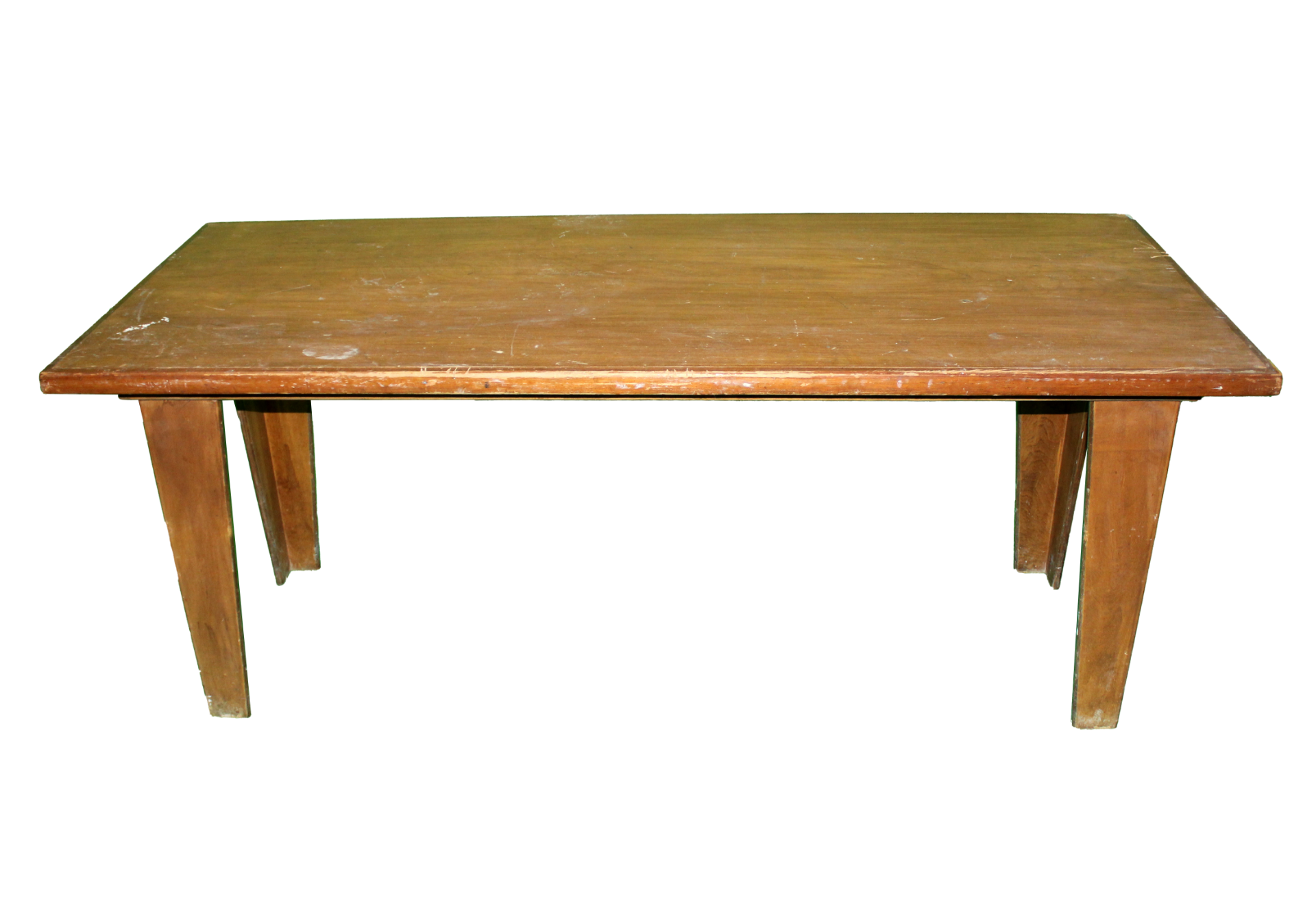 Orange/brown, painted, wooden rectangular table with rounded corners.