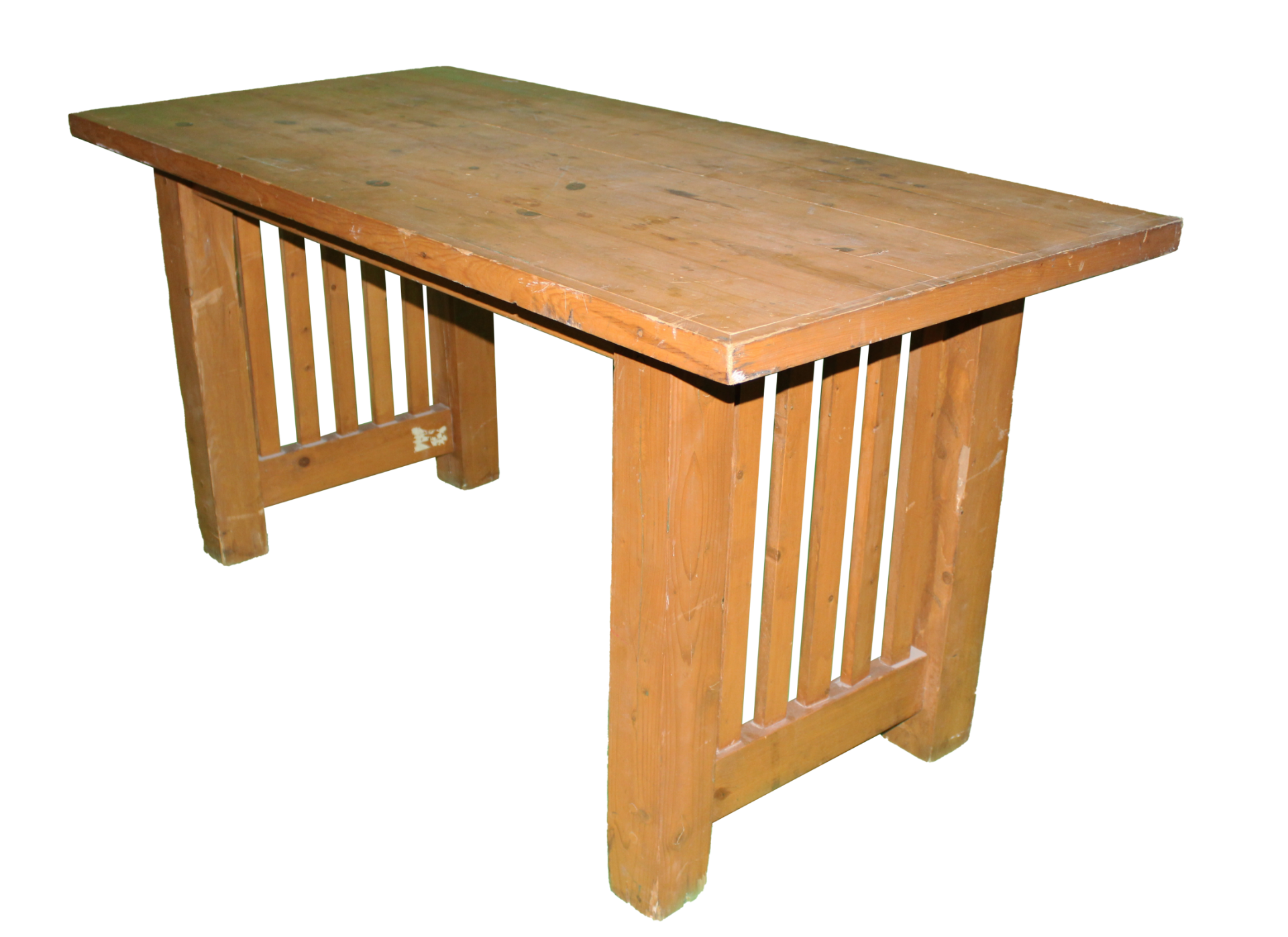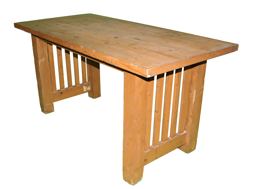 Light brown, wooden, rectangular table with vertical slats on the sides and overhanging top.