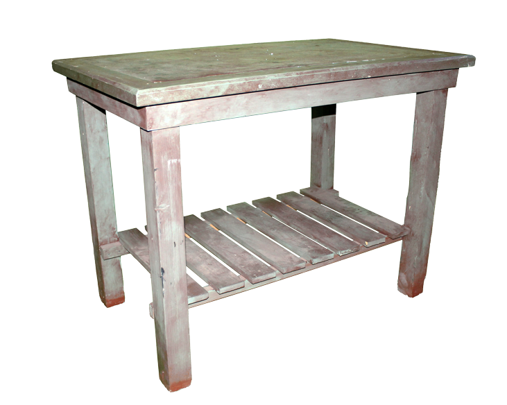 Pale green/red, wooden, rectangular table with bottom slat panel shelf and faux laminate top.