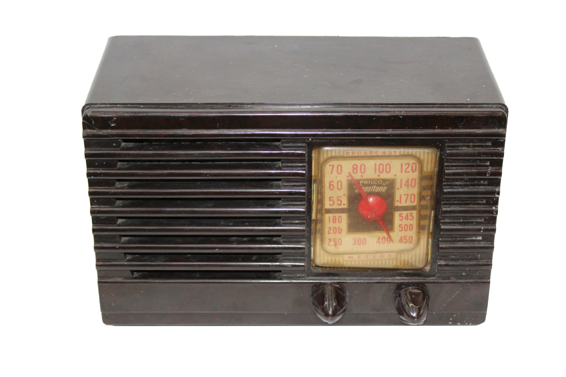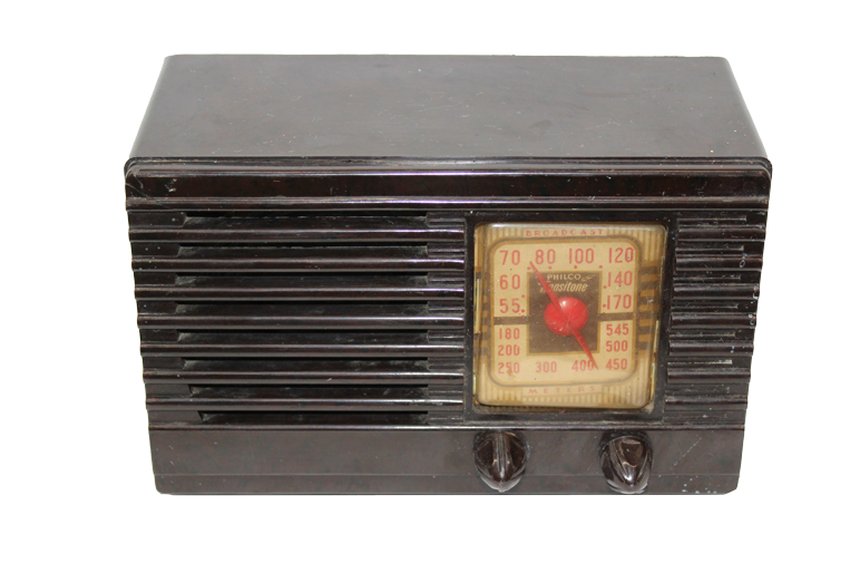Dark brown Philco Transitone PT-25 table radio with plastic cover.