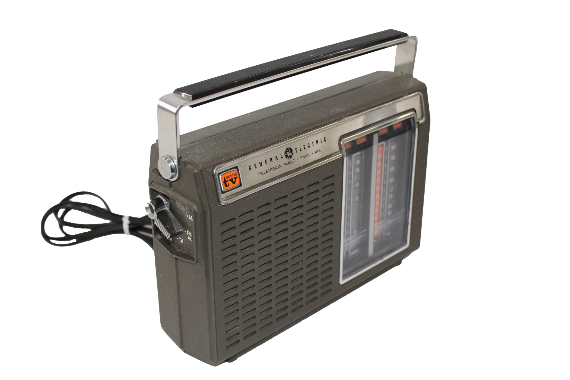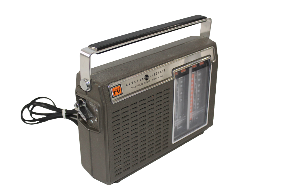 Taupe and chrome General Electric 7-2930B TV/AM/FM radio with handle and attached power cord.