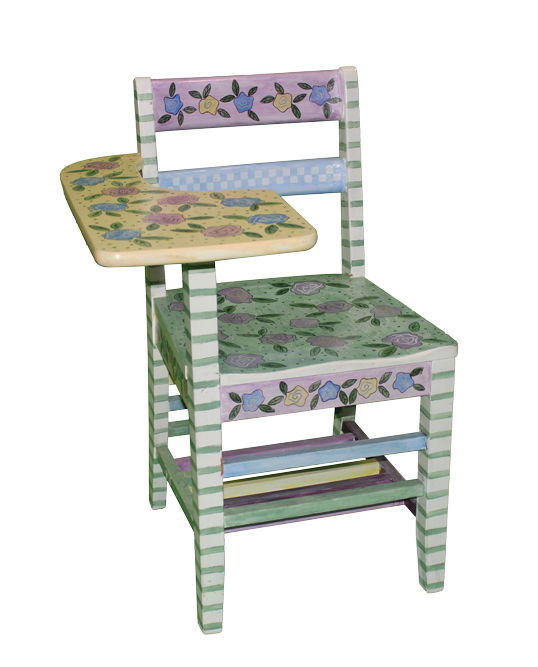 Yellow/green/blue/purple, wooden tablet-arm chair with hand painted flowers, stripes, and dots.