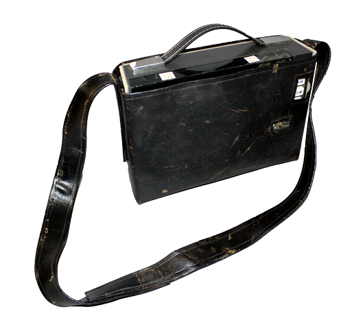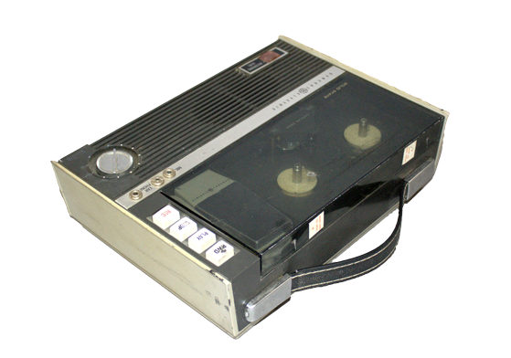 Grey and taupe General Electric M-8000 reel to reel tape recorder with microphone, attached handle and black leather carrying case.