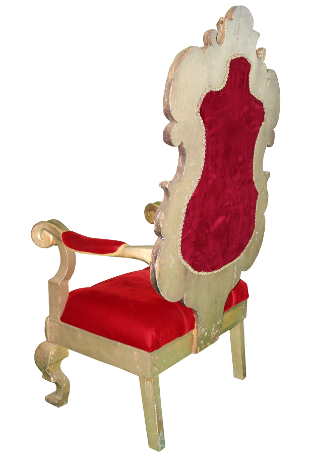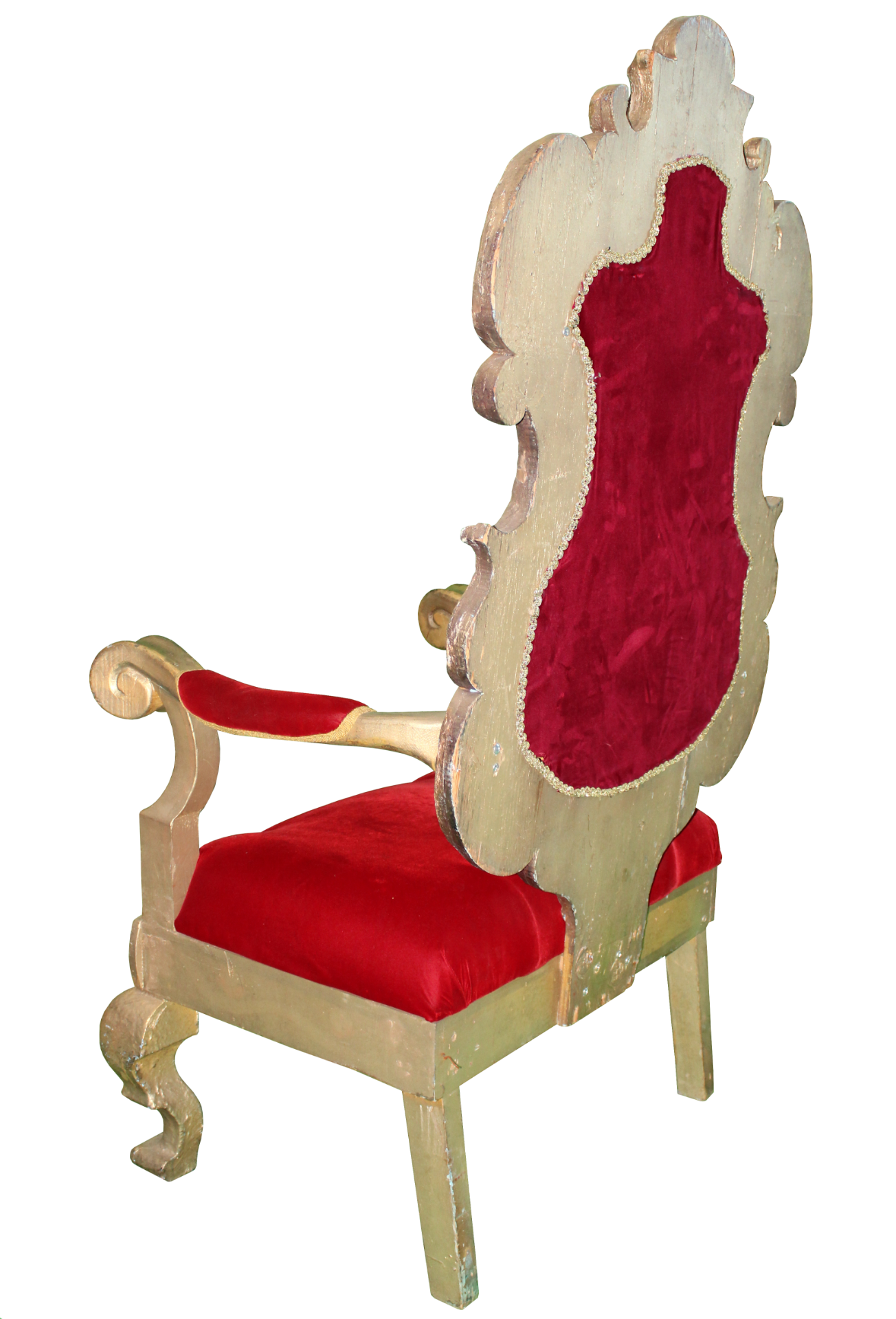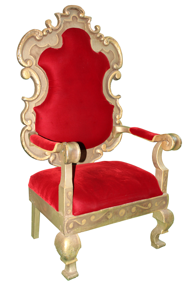Gold, wooden throne with red velvet upholstery, nailhead trim, and ornate top decor.