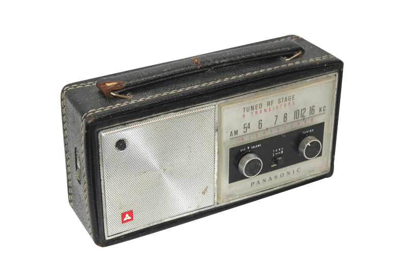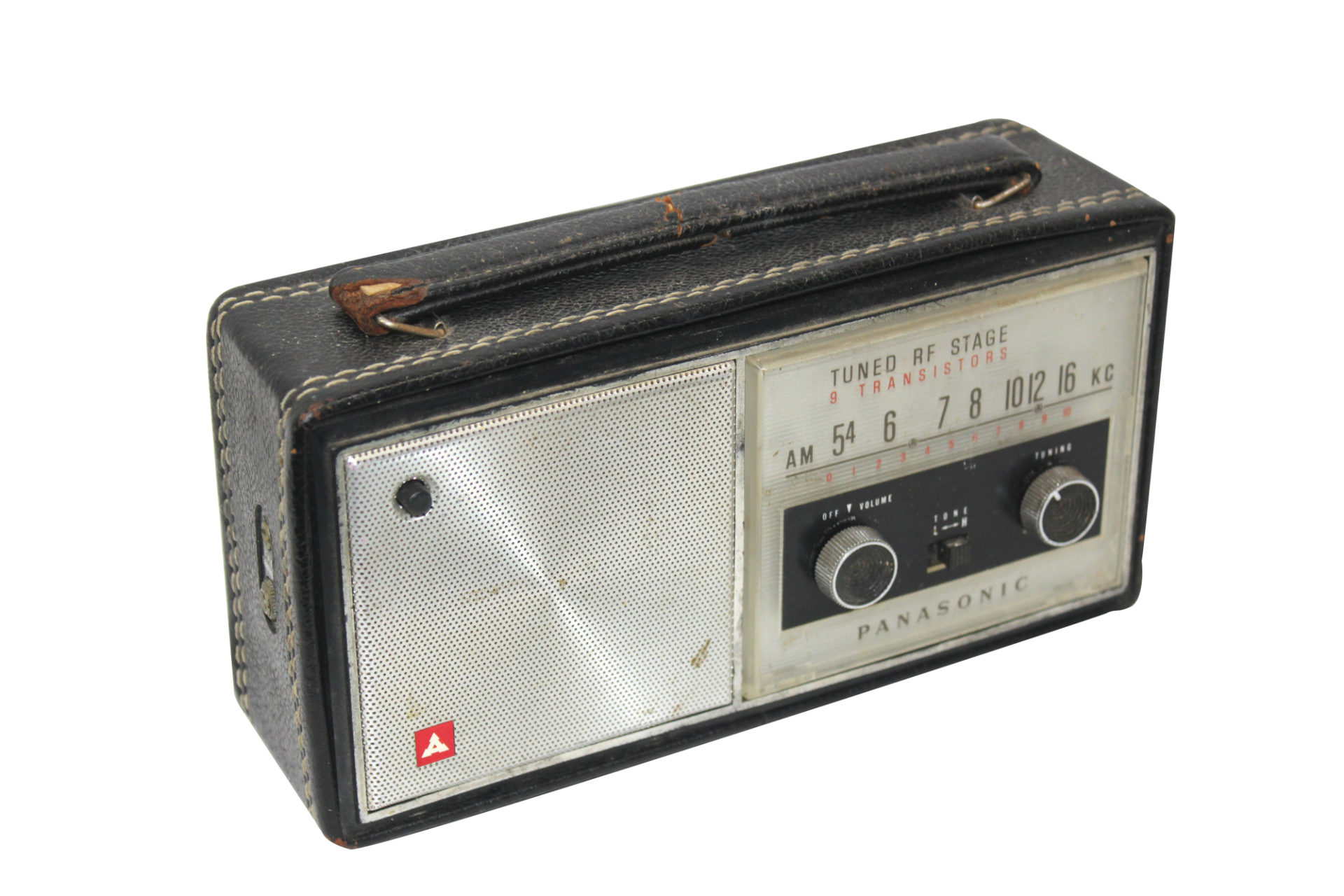 Black and Silver Panasonic R-109 transistor radio with leather cover and handle.