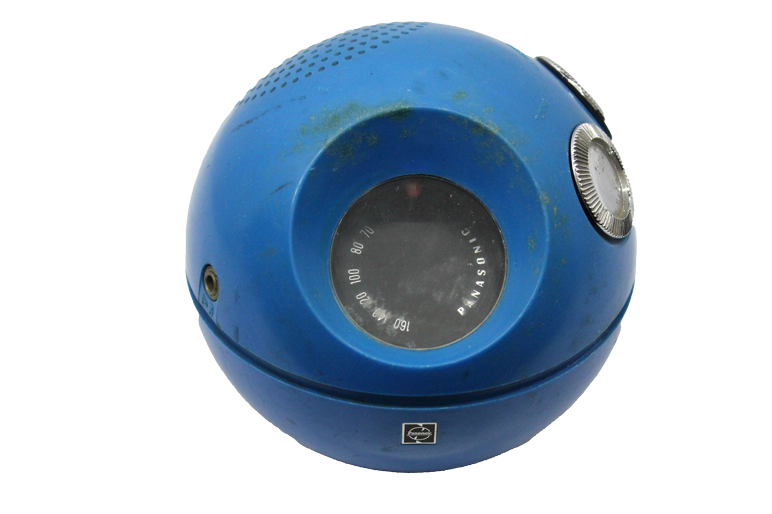 Blue, round Panasonic R-70 Panapet transistor radio with plastic cover.