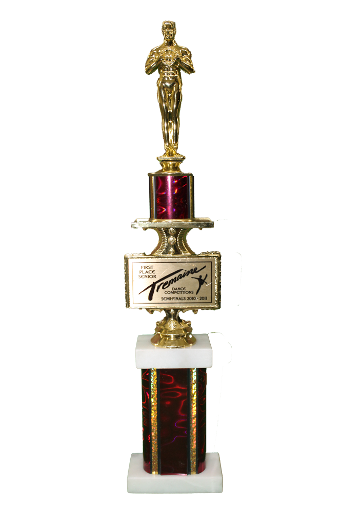 Red/black/gold, plastic, 1st place Tremaine tower trophy with gold man figure holding a wreath topper and white, marble base.