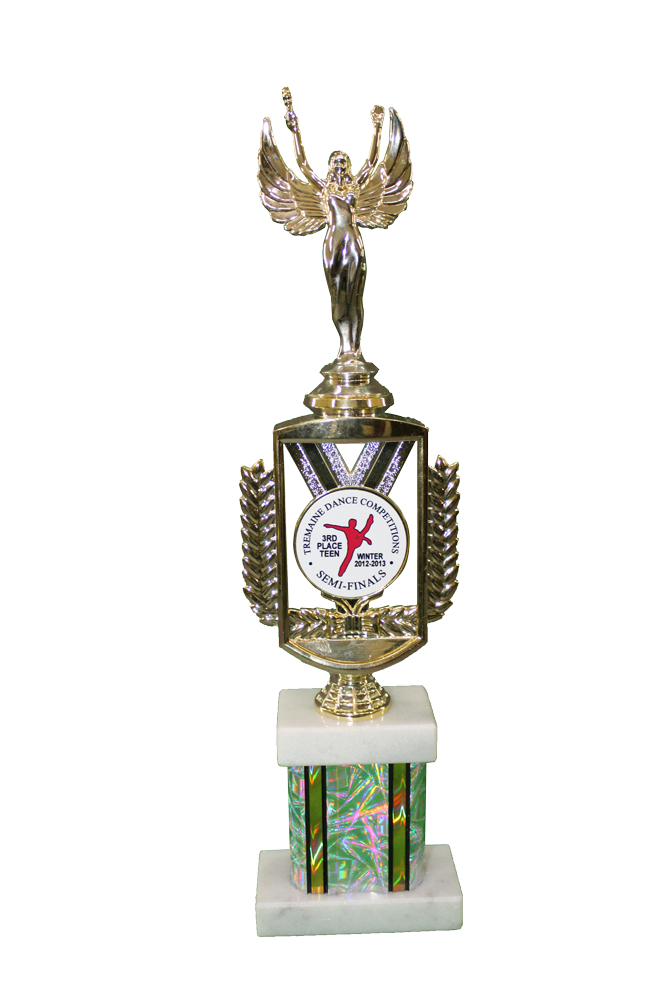Silver/gold, plastic, 3rd place Tremaine tower trophy with angel top and white, marble base.