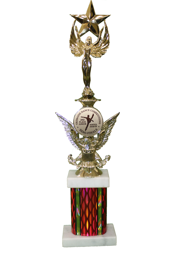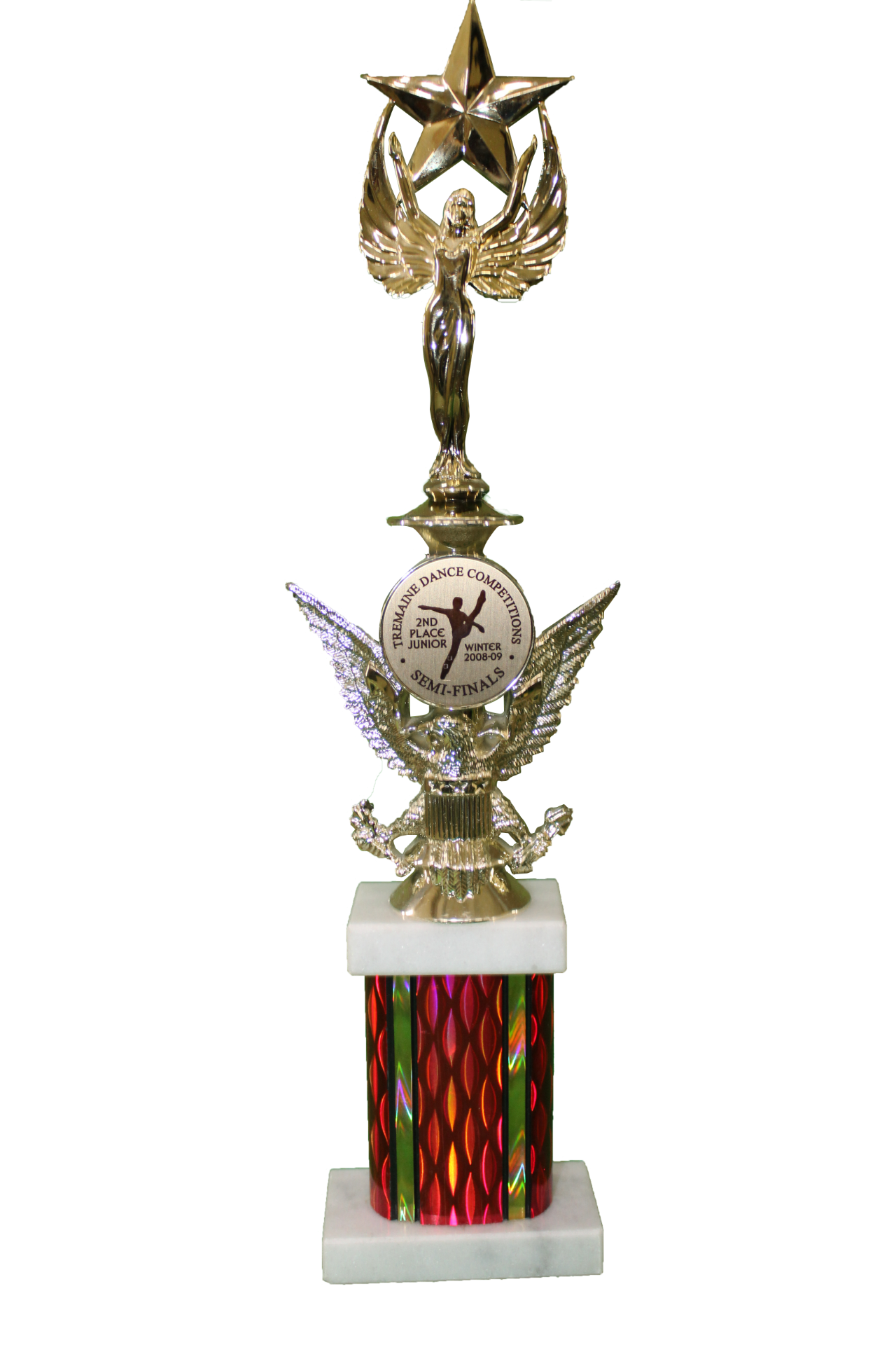 Red/gold, plastic, 2nd place Tremaine tower trophy with eagle and angel topper and white, marble base.