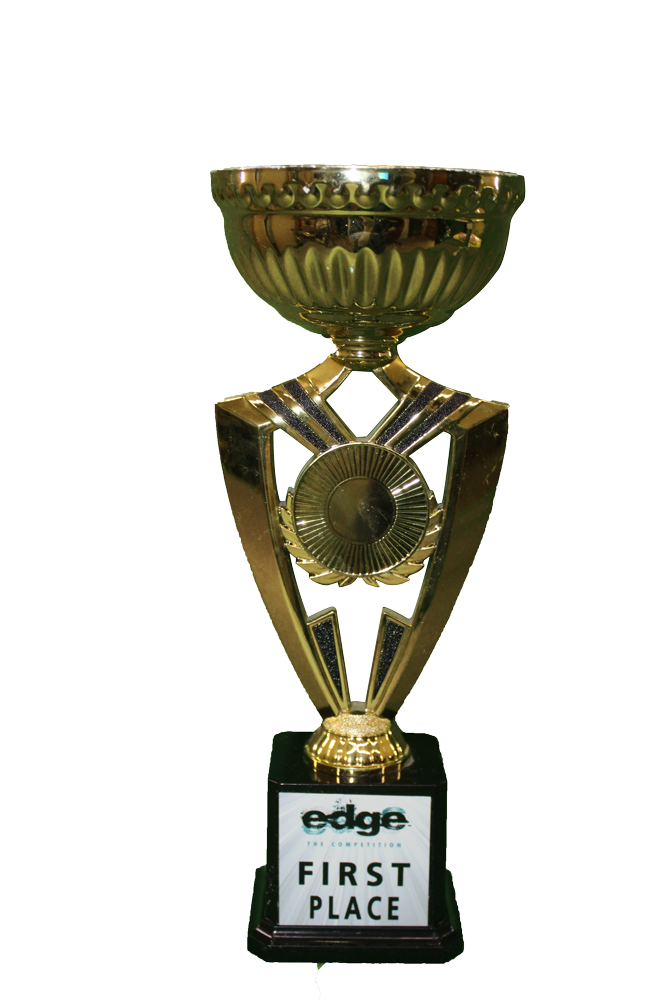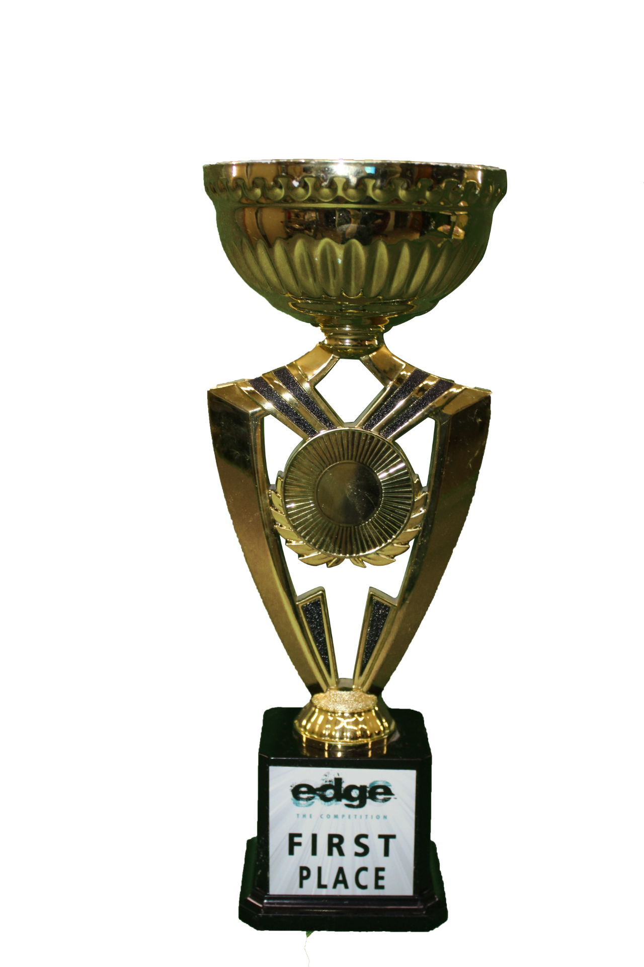 Gold, plastic, 1st place tower trophy with gold, metal, bowl topper and black base.
