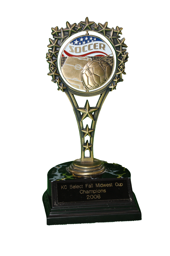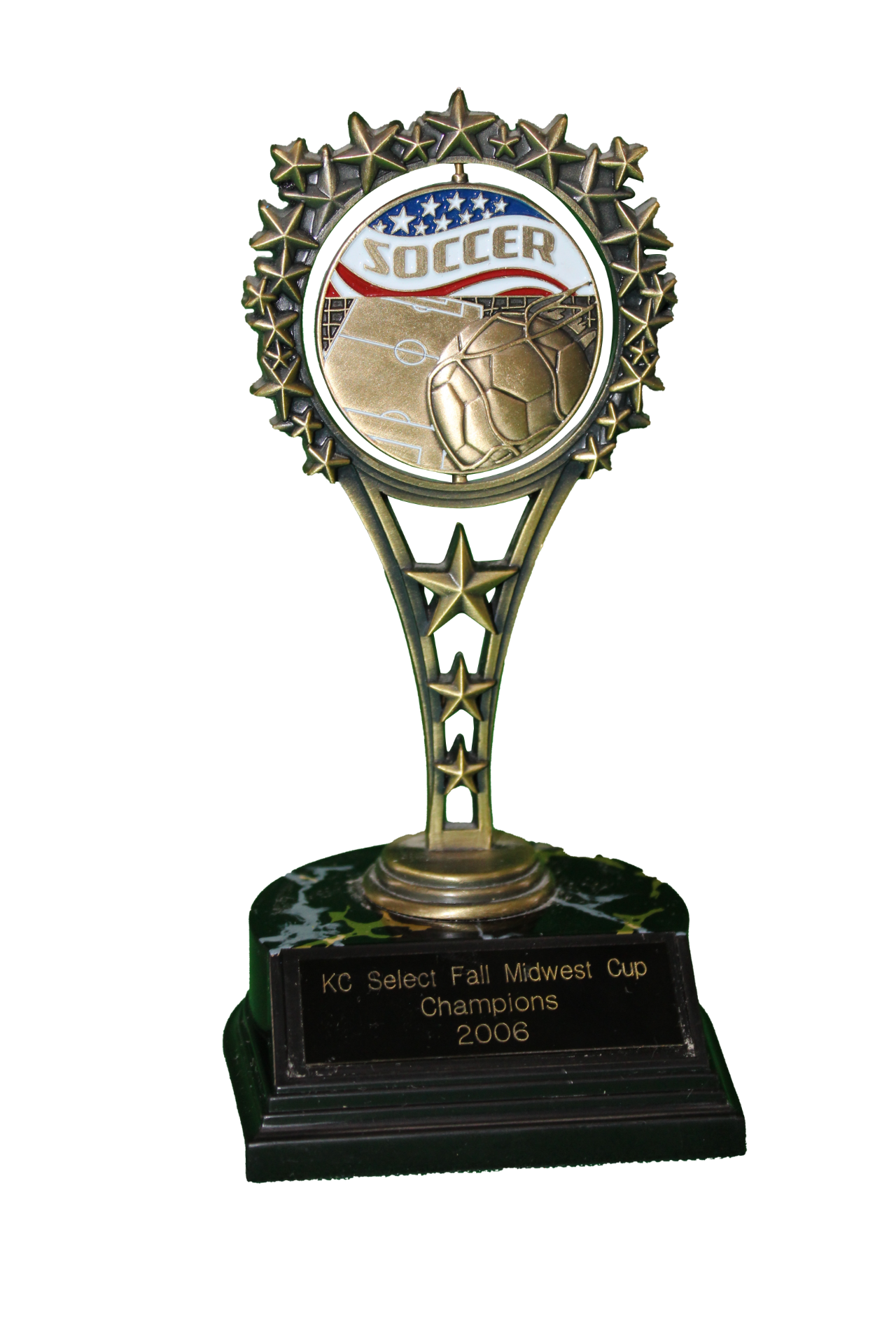 Bronze star tower trophy with black faux marble base and revolving soccer medallion.