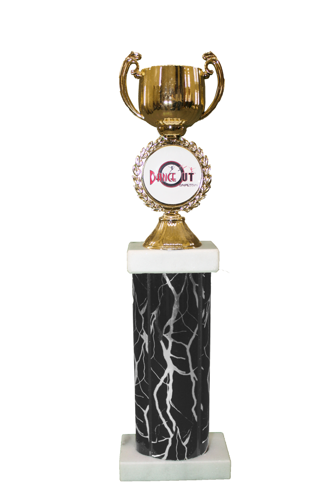 Black/silver, plastic tower trophy with gold cup top and white, marble base.