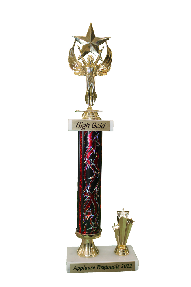 Red/black/gold, plastic tower trophy with angel and star topper and white, marble base.