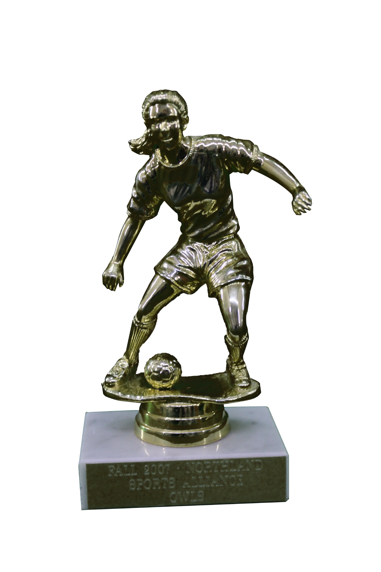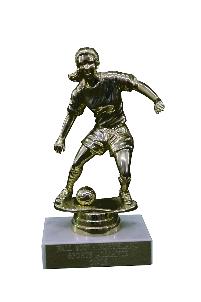 Gold, plastic, soccer girl figure trophy with white marble base.