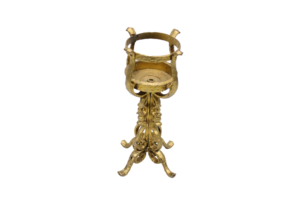 Gold, metal, scrollwork, pillar candle pedestal with four feet.