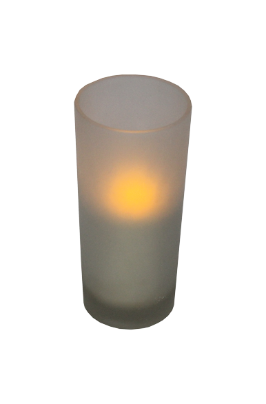 White, plastic, battery operated candle with cylindrical, frosted glass holder.