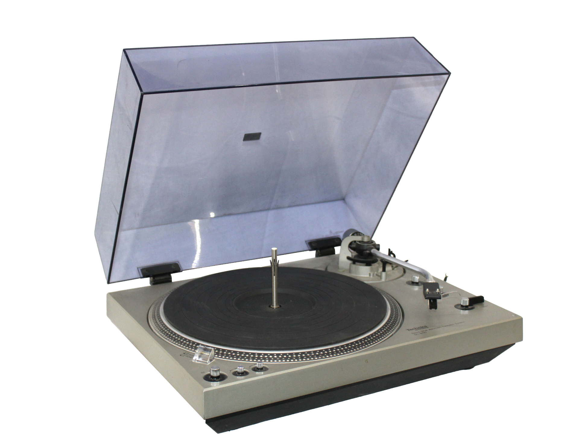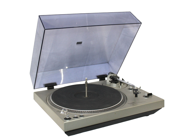 Grey and black Technics by Panasonic SL-1650 automatic turntable with transparent blue lid, attached dual RCA audio cable and attached power cord.