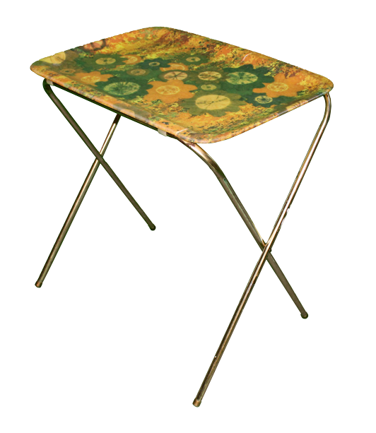 Gold, metal, folding TV tray table with plastic, clip on tray with orange/green/yellow/brown floral design.