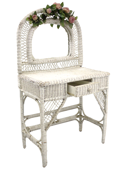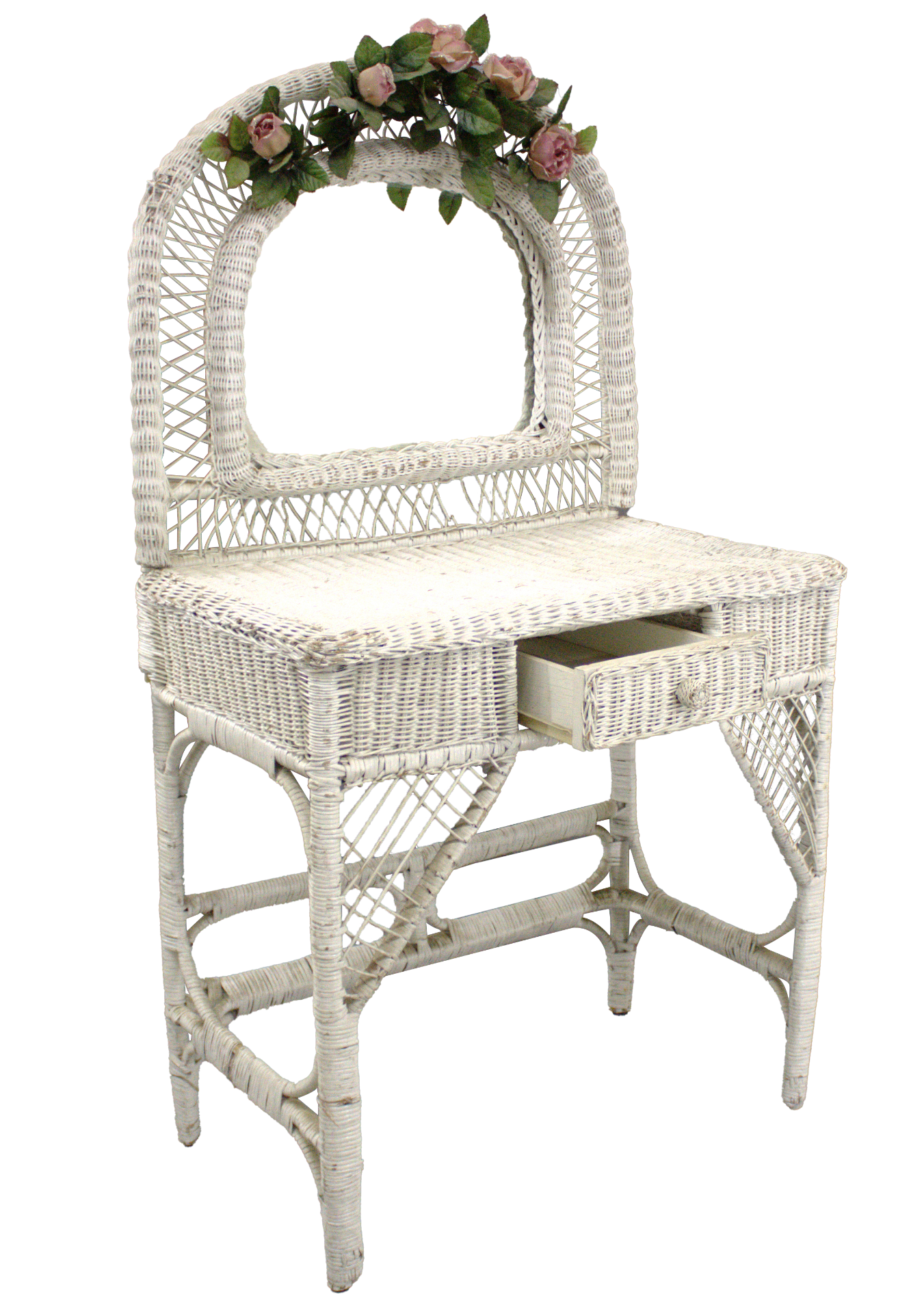 White, wicker vanity desk with drawer and arch mirror with artificial roses at the top.