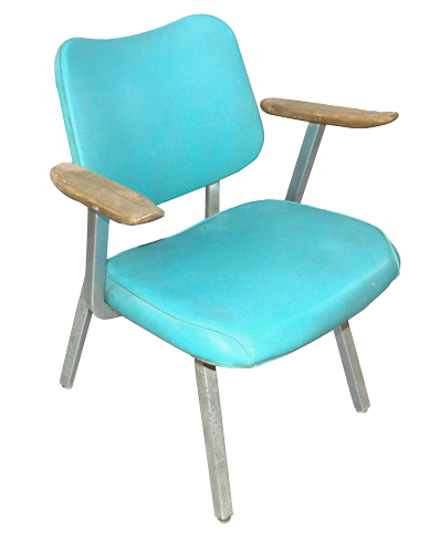 Teal, vinyl armchair with metal frame and wooden arm tops.