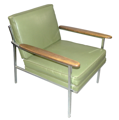 Olive green, vinyl armchair with metal frame and wooden arm tops.