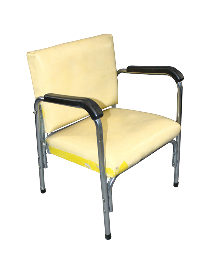 Sun-faded yellow, vinyl, reclining armchair with metal frame and black, plastic arm tops.