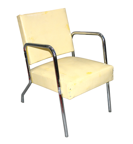 Pale yellow, vinyl upholstered armchair with metal frame.