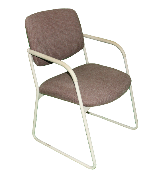 Taupe, fabric upholstered arm chair with beige, metal frame.