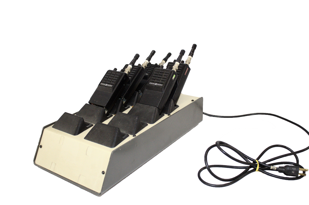 Grey and beige General Electric eight slot walkie talkie charger with five radio units and detached power cord.
