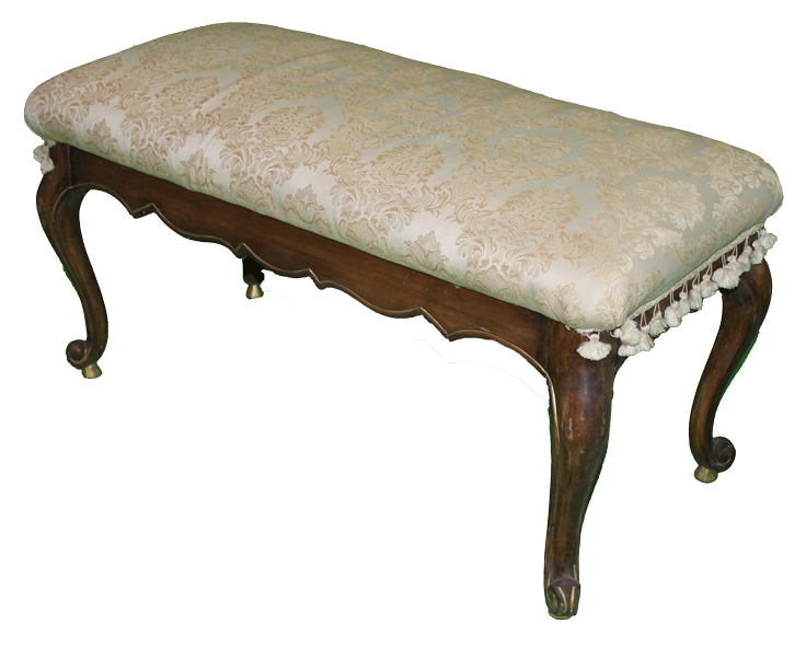 Off white, brocade fabric upholstered bench with white pom-pom tassel trim on the sides and wooden, cabriole legs.