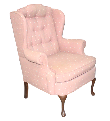 Pink, fabric upholstered, wingback armchair with light pink floral pattern, wooden legs, and tufted inside back.