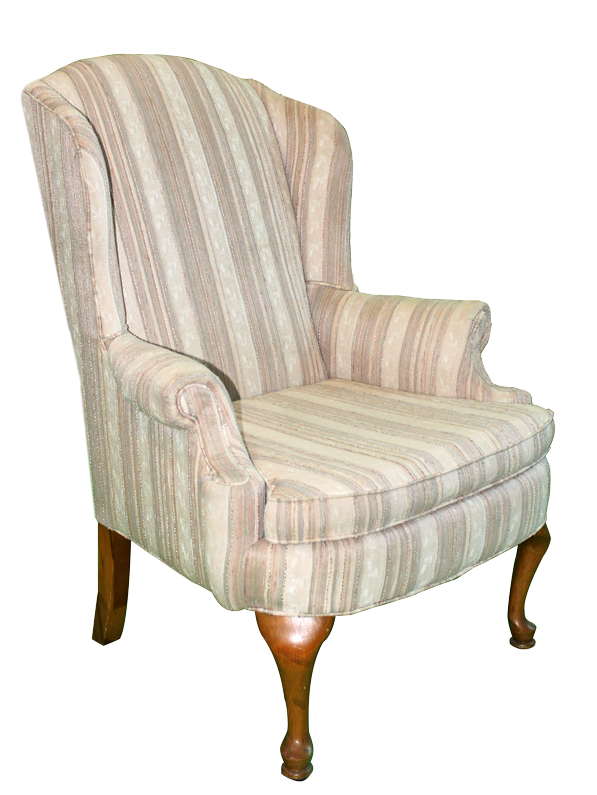Beige, fabric upholstered, wingback armchair with vertical stripe pattern and wooden legs.