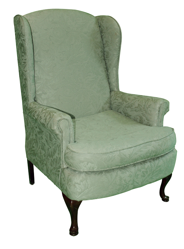 Light green, brocade upholstered, wingback armchair with wooden legs.